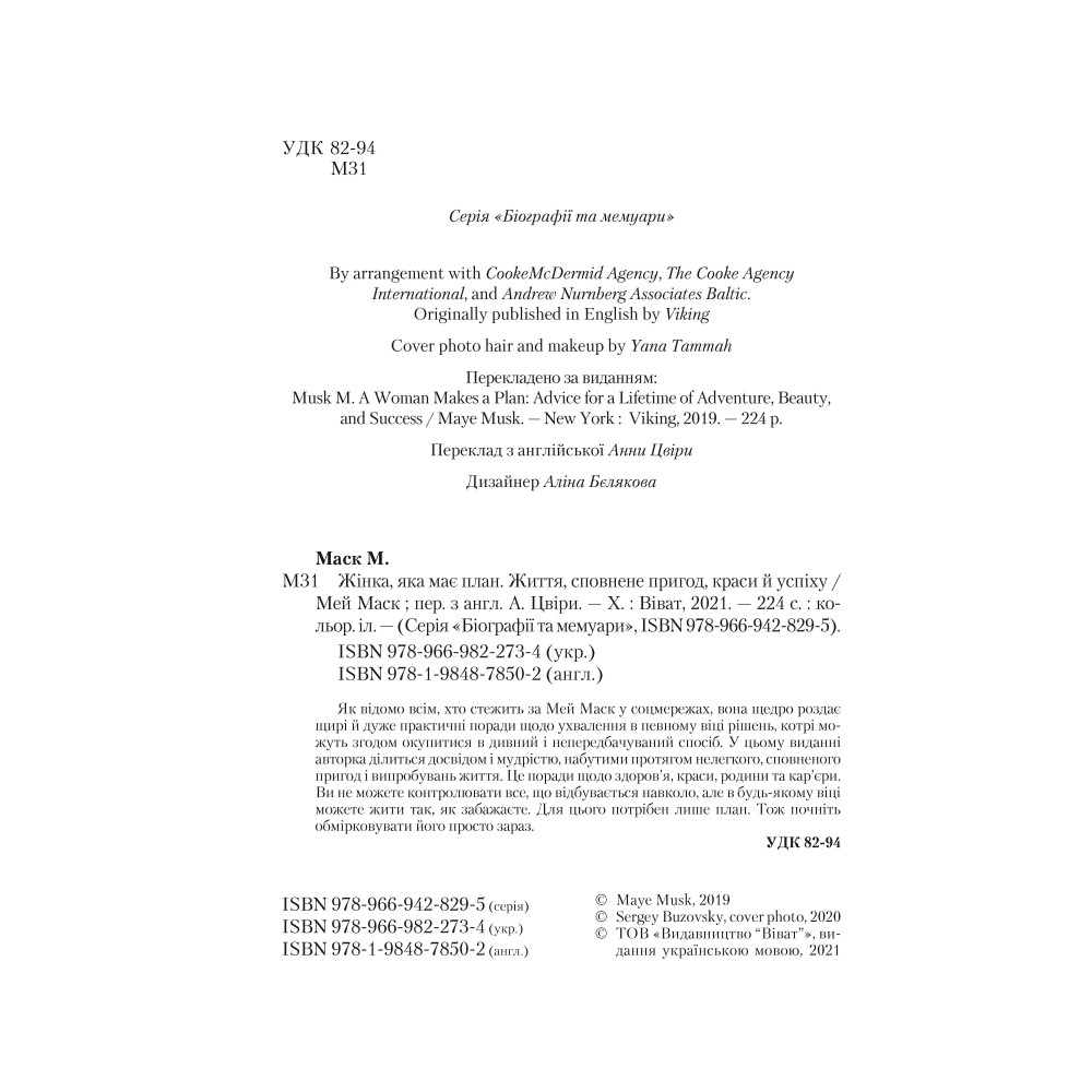 Как известно всем, кто следит за Мэй Маск в соцсетях, она щедро раздает искренние и очень практические советы по принятию в определенном возрасте решений, которые могут впоследствии окупиться странным и непредсказуемым способом. В этом издании автор делится опытом и мудростью, приобретенными в течение нелегкого, исполненного приключений и испытаний жизни. Это советы по здоровью, красоте, семье и карьере. Вы не можете контролировать все происходящее вокруг, но в любом возрасте можете жить так, как хотите. Для этого требуется только план. Так что начните обдумывать его прямо сейчас.